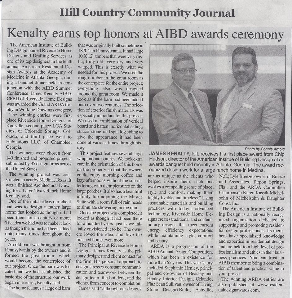 The American Institute of Building Design (AIBD) named Riverside Home Designs and Drafting Services as one of its top designers in the American Residential Design Awards (ARDA). James KenaltyAIBD, CPBD of Riverside Home Designs was awarded the Grand ARDA trophy in the Working Drawings category, selected from finished and proposed projects submitted by design firms across the United States. View the complete award-winning plan set →